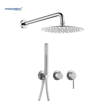 Cabezal de ducha de lluvia redondo de 10 pulgadas Níquel cepillado Sistema de kit de ducha oculto de pared de dos manijas con áspero en caja